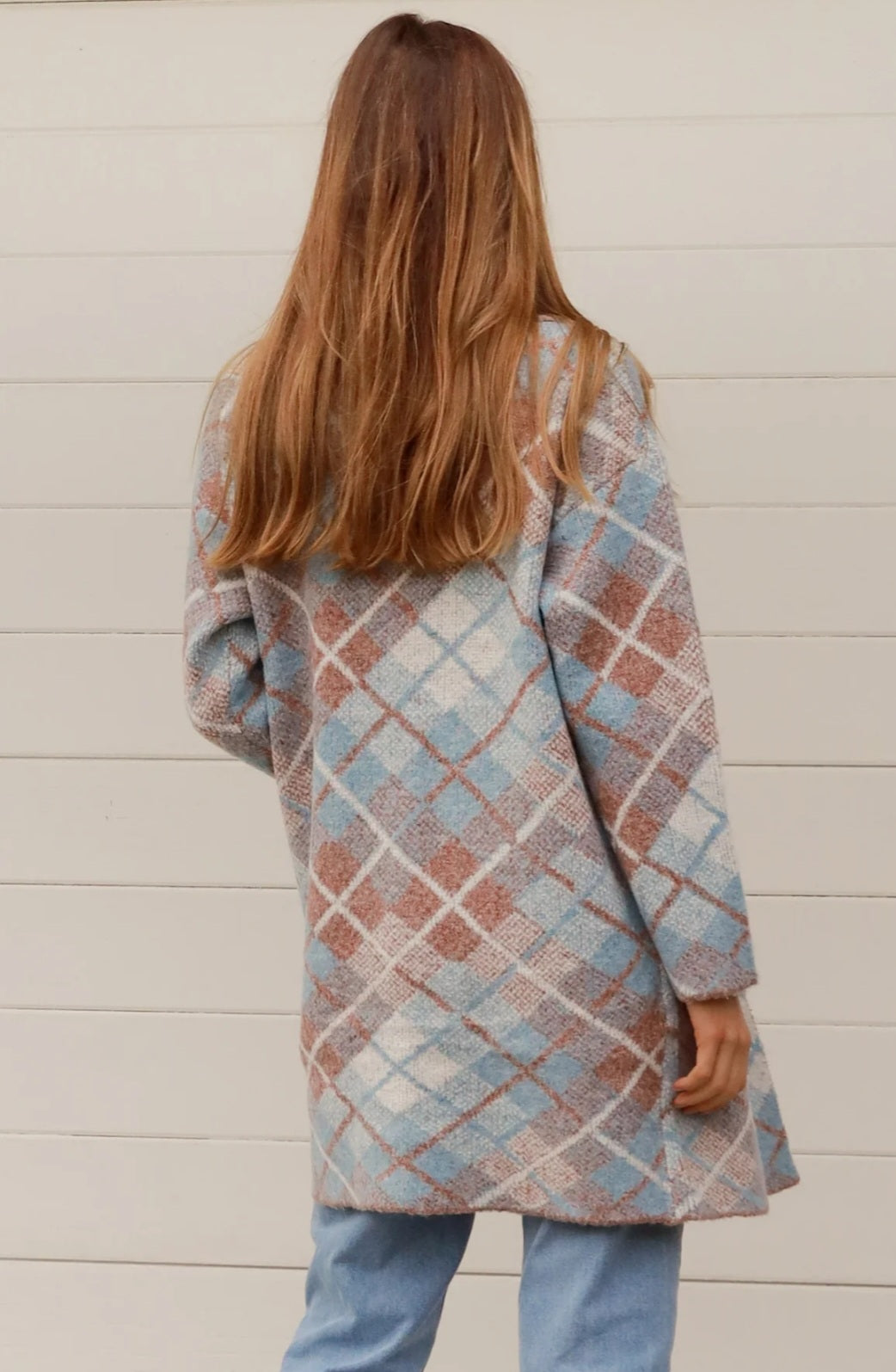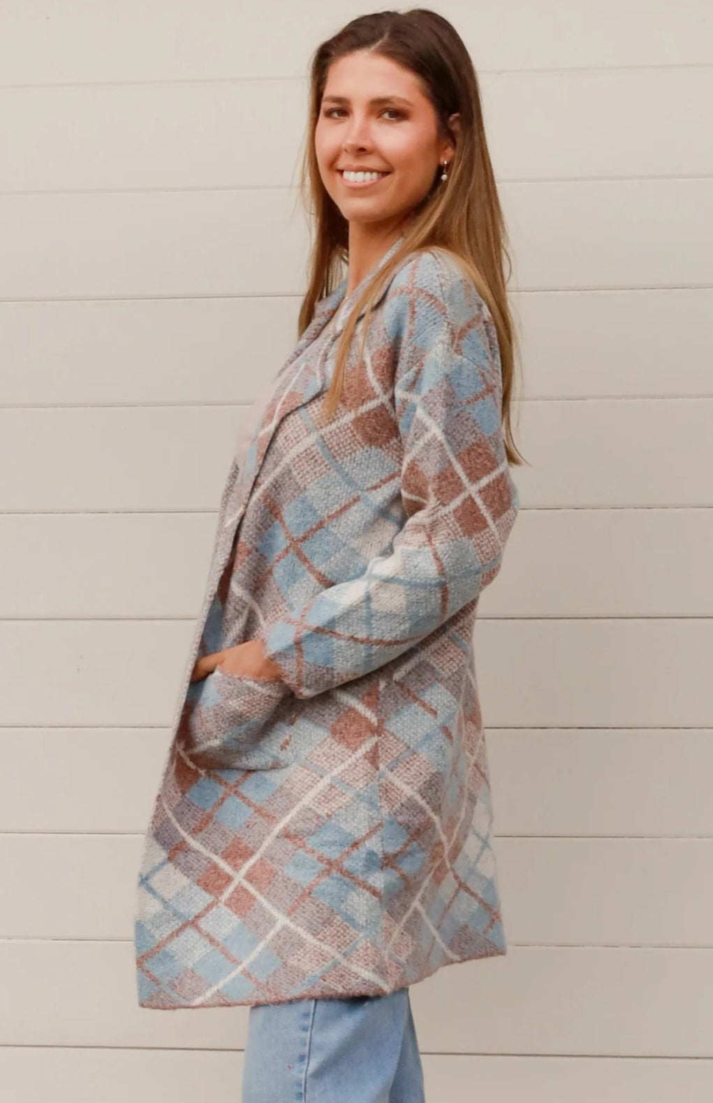 Stay warm and stylish with the Britney Cardigan. Made with a soft tartan pattern and a blend of acrylic and wool, this long length cardigan is soft and cosy. Complete with front pockets and a lapel, this cardigan is a must-have for chilly days.